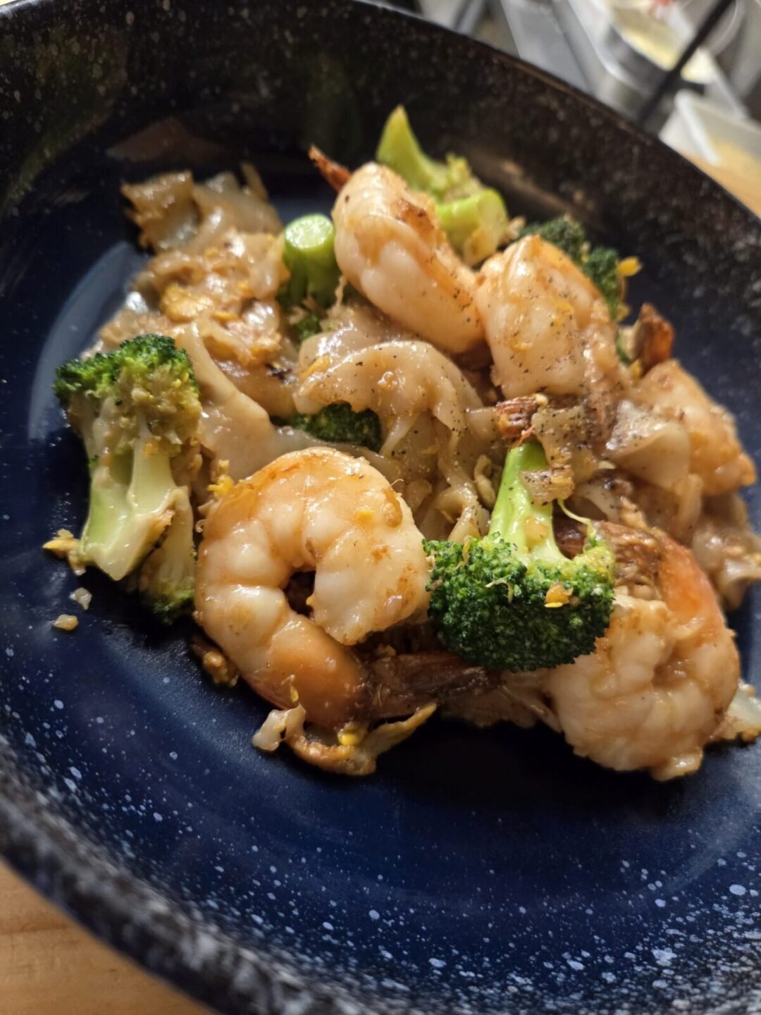Stir-fried wide rice noodles with broccoli and your choice of protein, finished with a hint of sweetness and smoky flavor.