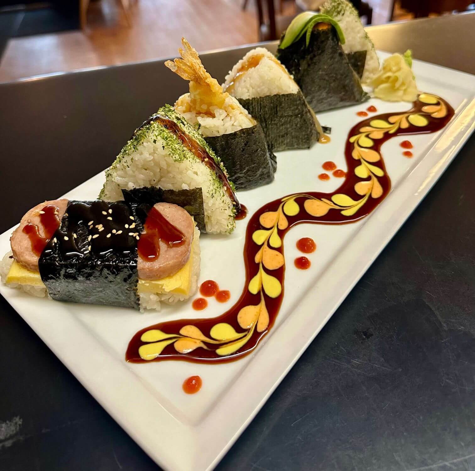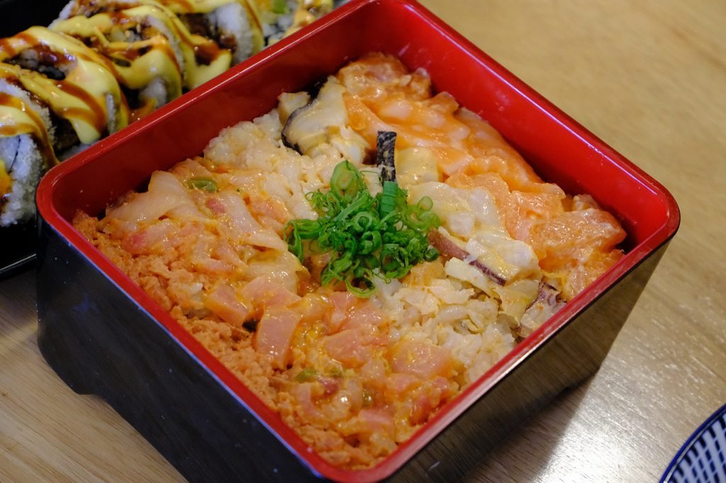 Tuna, salmon, Japanese omelet, and scallion, topped with seared hamachi, miso mayo, black pepper, miso glaze and ikura.